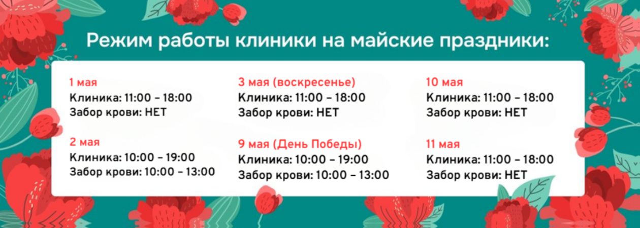 РЕЖИМ РАБОТЫ КЛИНИКИ В МАЙСКИЕ ПРАЗДНИКИ
